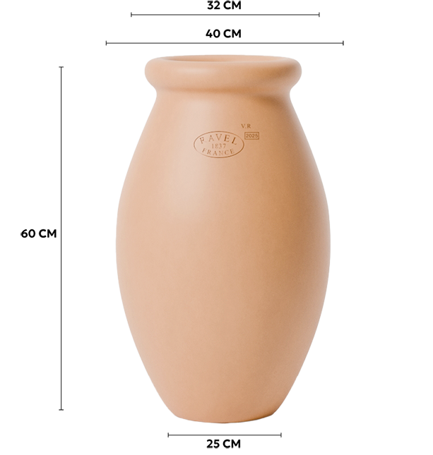 This chic jar, a little aristocratic is molded by hand in our workshops in Aubagne in Provence with a natural clay. Its narrow line fits perfectly on a staircase, in the corner of a terrace or in the alcove of a garden. This jar prefers flowering or climbing flowers rather than shrubs.