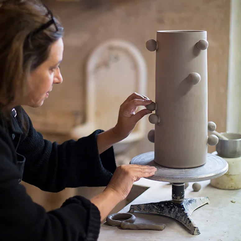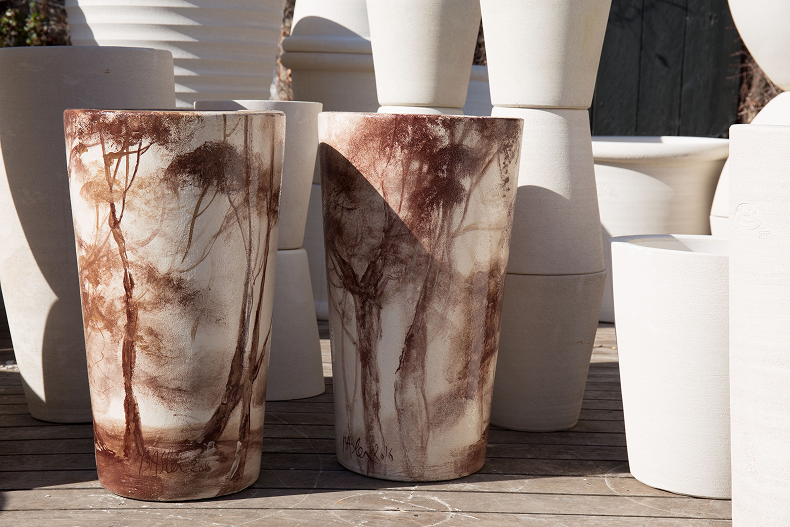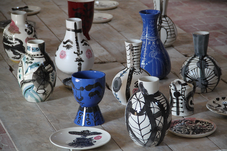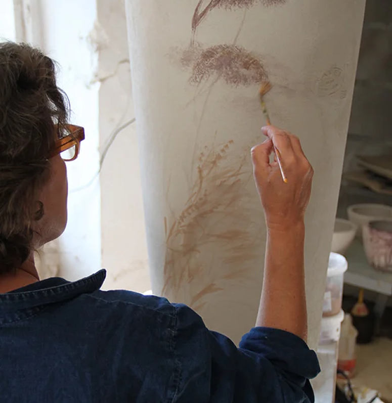 Claire Basler est une femme et une artiste rare. Sa résidence au sein de la Poterie a commencé un été très chaud. Elle cherchait un fabricant de grands vases pour réaliser des décors façon Barbotine, évidemment végétaux.