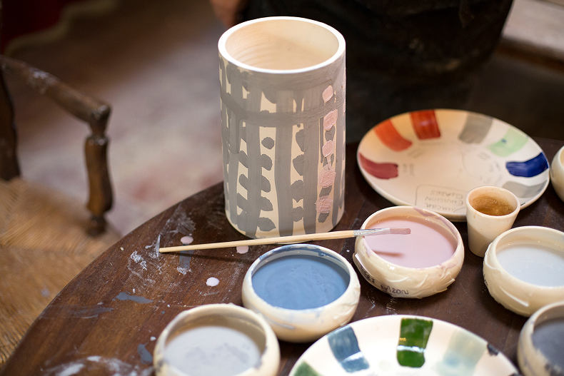 Pour sa première résidence, India a réalisé des pièces uniques en dessinant à l’émail sur des vases tube, tournés par Thierry Lachaume, notre potier. Elle a également dessiné la collection « Marble », des vases à bouquets avec des boules, unis ou multicolores.